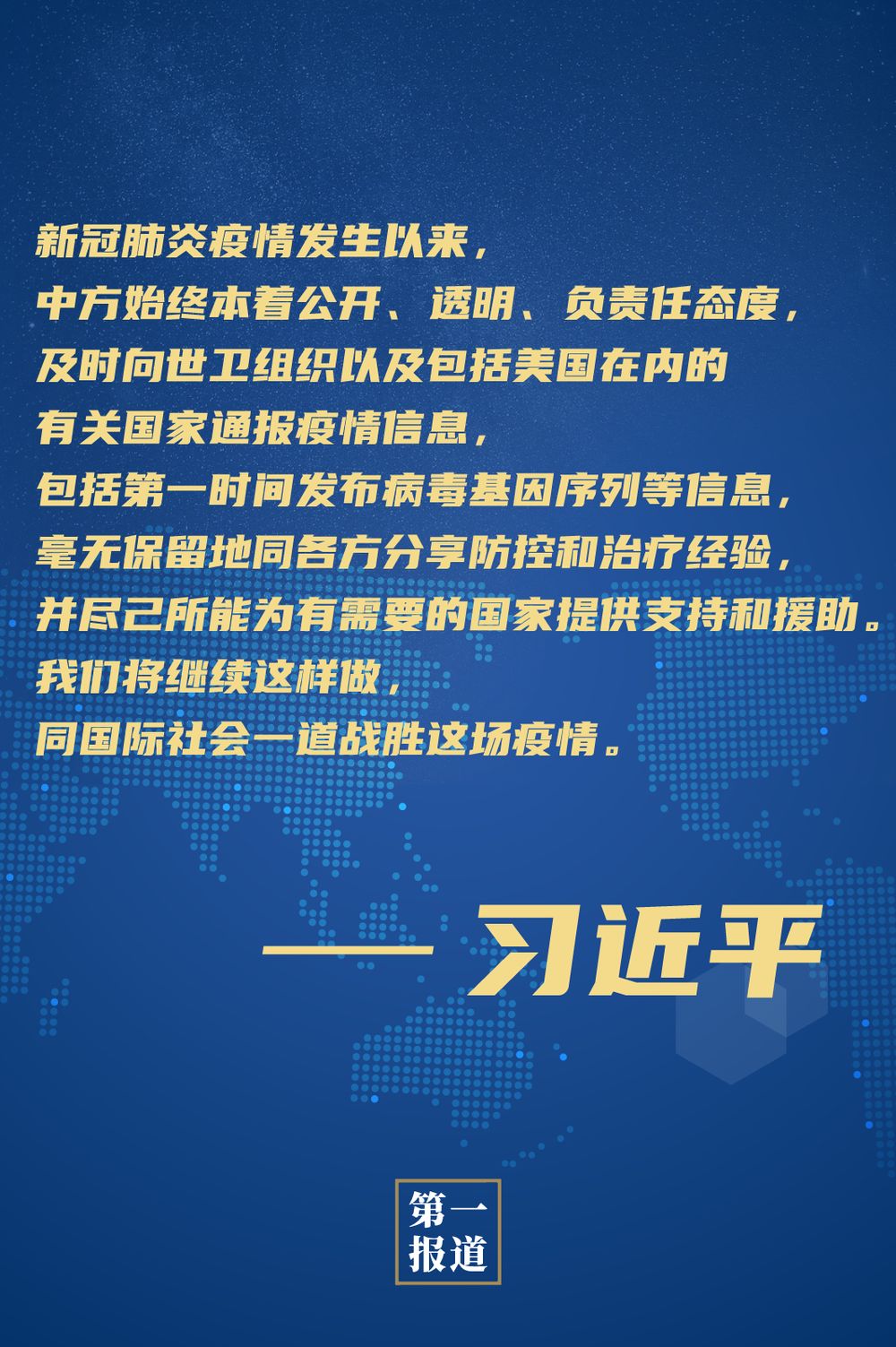 习近平强调,新冠肺炎疫情发生以来,中方始终本着公开、透明、负责任态度,及时向世卫组织以及包括美国在内的有关国家通报疫情信息,包括第一时间发布病毒基因序列等信息,毫无保留地同各方分享防控和治疗经验,并尽己所能为有需要的国家提供支持和援助。我们将继续这样做,同国际社会一道战胜这场疫情。