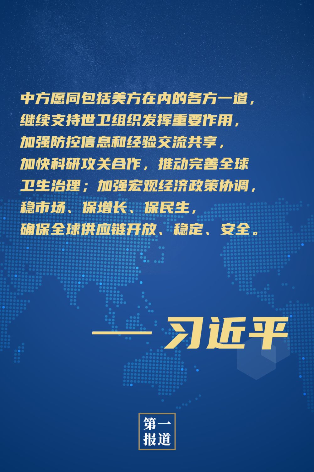 习近平指出,流行性疾病不分国界和种族,是人类共同的敌人。国际社会只有共同应对,才能战而胜之。在各方共同努力下,昨天举行的二十国集团领导人应对新冠肺炎特别峰会达成不少共识,取得积极成果。希望各方加强协调和合作,把特别峰会成果落到实处,为加强抗疫国际合作、稳定全球经济注入强劲动力。中方愿同包括美方在内的各方一道,继续支持世卫组织发挥重要作用,加强防控信息和经验交流共享,加快科研攻关合作,推动完善全球卫生治理;加强宏观经济政策协调,稳市场、保增长、保民生,确保全球供应链开放、稳定、安全。