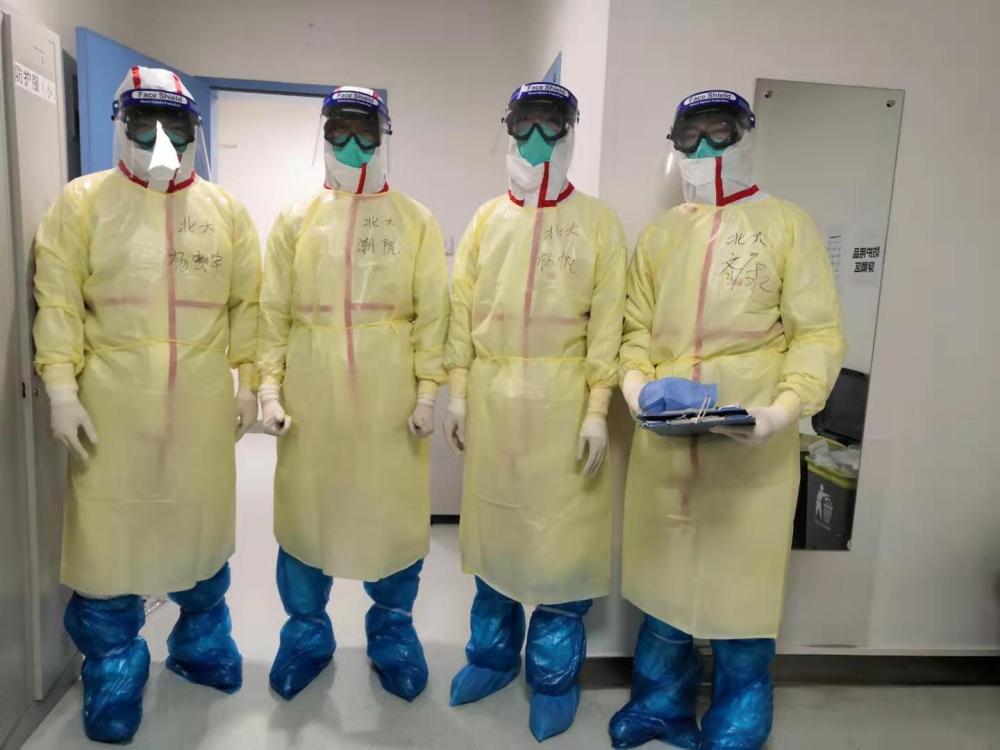 图为北京大学第一医院援湖北医疗队李海潮与同事在武汉工作中合影。