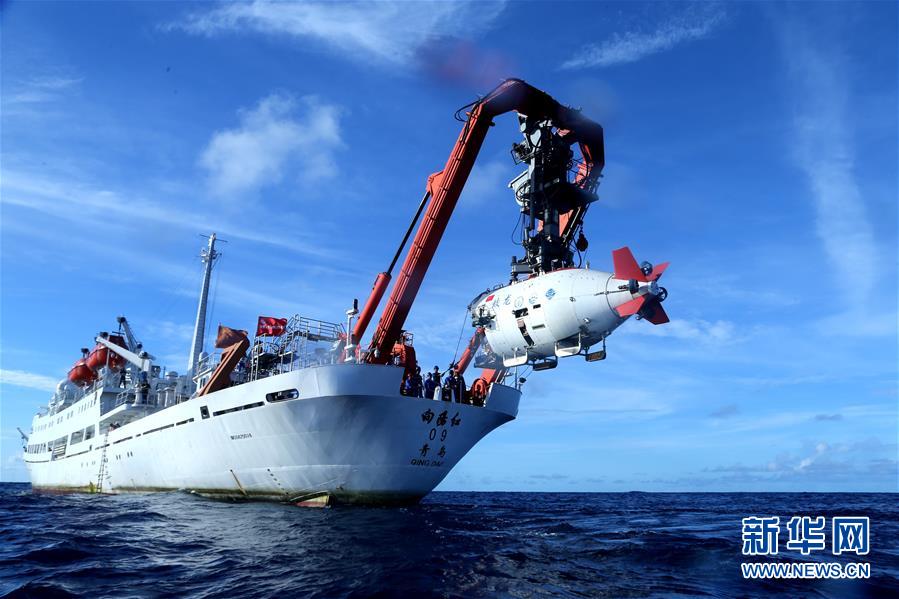 在西太平洋海域,“蛟龙”号载人潜水器离开“向阳红09”科学考察船准备进入水中,进行中国大洋38航次最后一潜(2017年6月13日摄)。 新华社记者 刘诗平 摄
