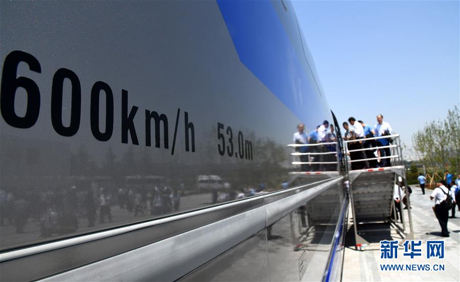 2019年5月23日,参观人员在山东青岛登上时速600公里高速磁浮试验样车参观。 新华社记者李紫恒摄