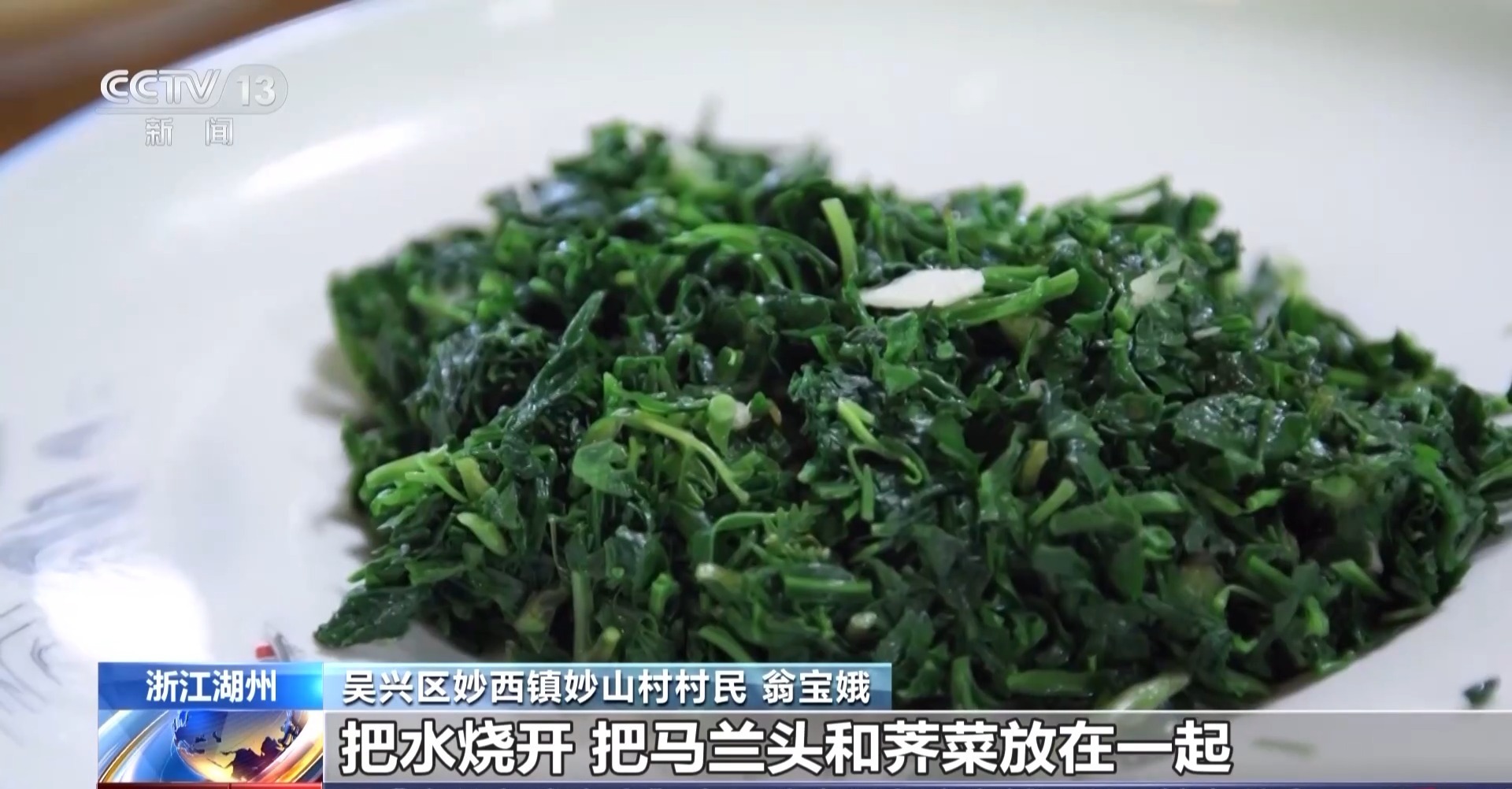 吴兴区妙西镇妙山村村民 翁宝娥:把水烧开,把马兰头和荠菜放在一起,焯个水就好了。野菜炒肉丝可以吃,炒笋丝也可以吃。