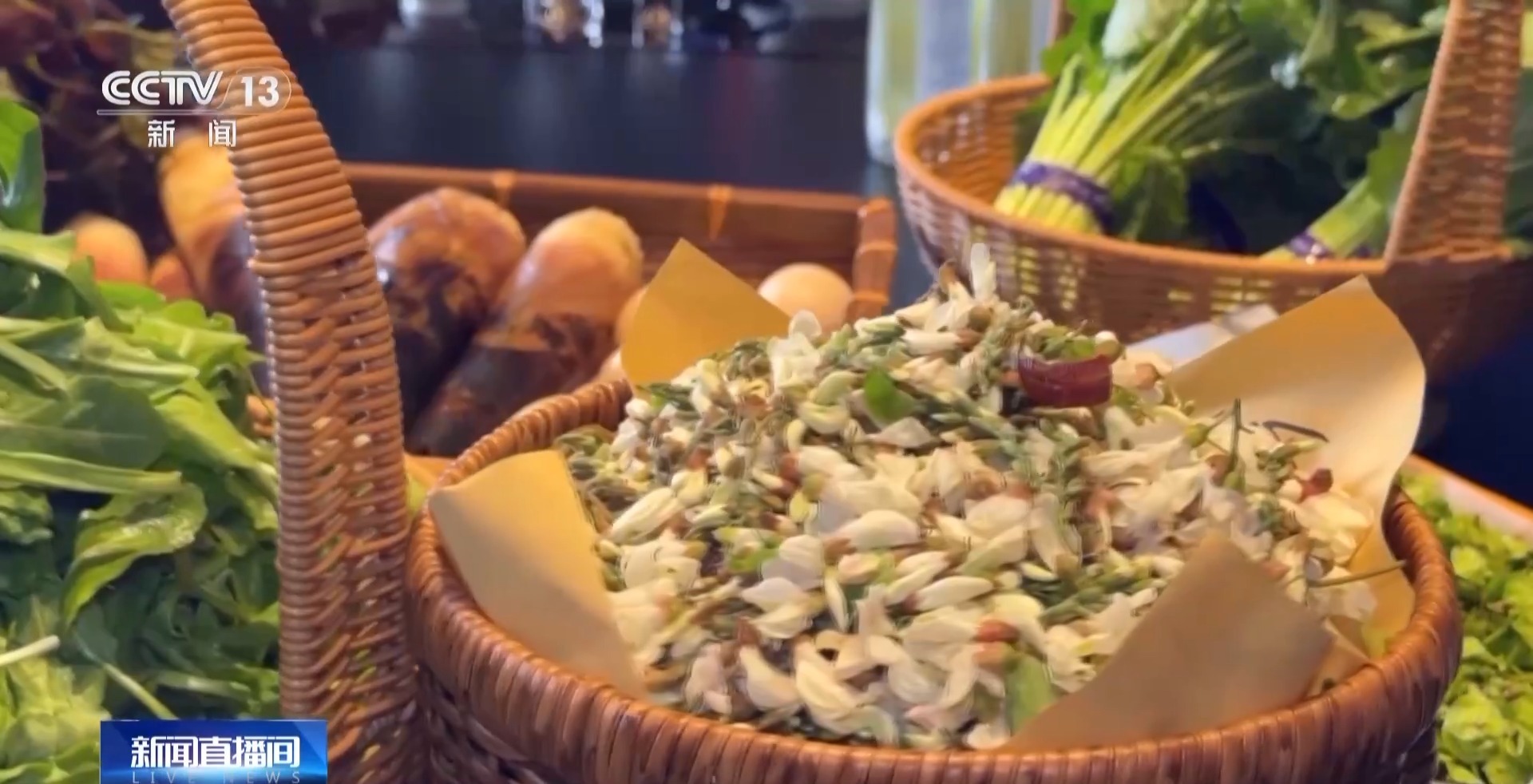 厨师长 邹建:挑选春天的食材的时候就是以鲜嫩为主,这个香椿有两种,一种就是红香椿,一种是绿香椿。但是红香椿更香、鲜嫩一点,味道更好一点,挑选的时候首先从外表开始看,是不是特别嫩,这个根部是不是老,用手可以掐一下。槐花也是季节菜,尽量选不开花那种,嫩一点,榆钱也是选那种颜色比较翠绿的,有新鲜度的,比较支棱一点的。