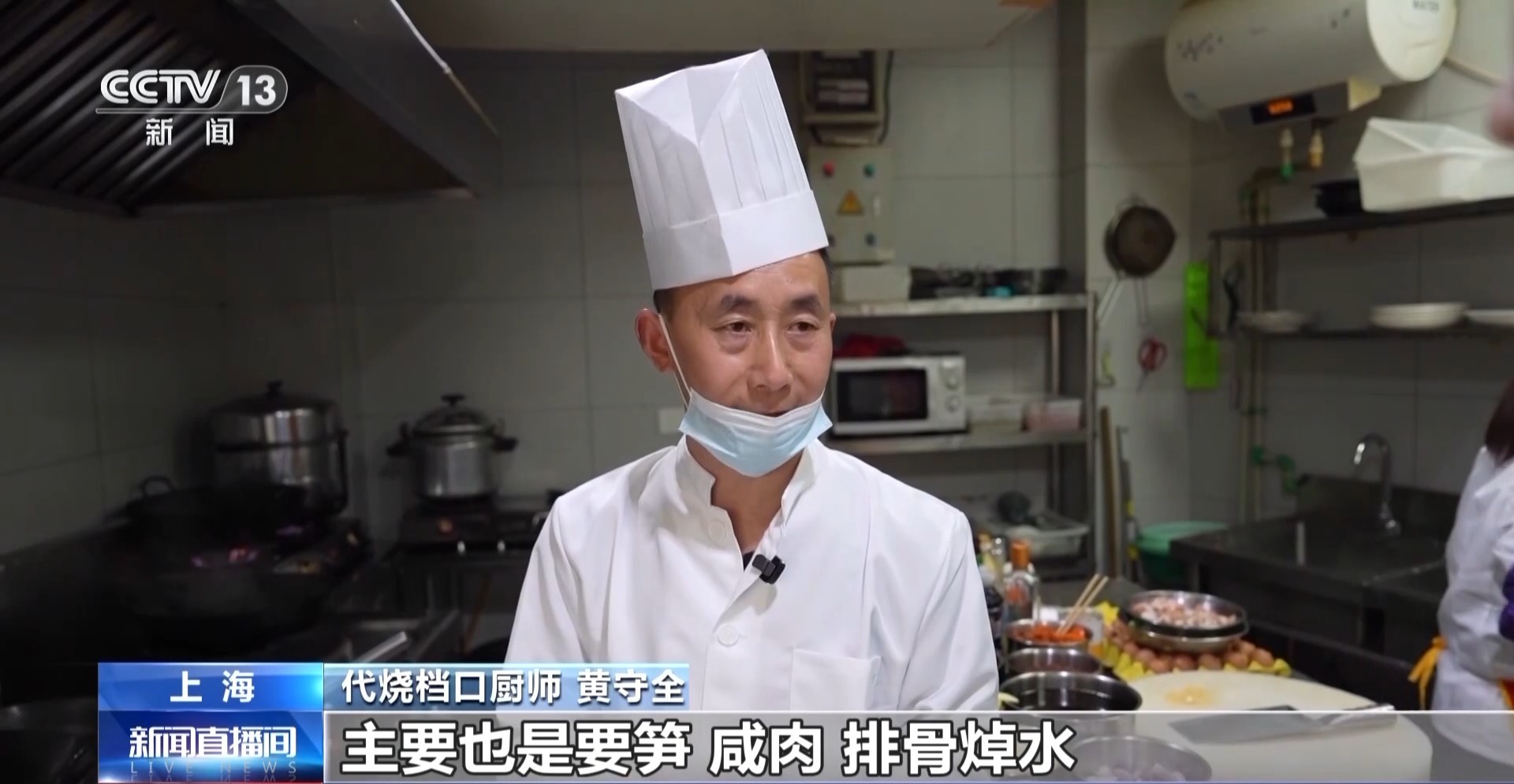 代烧档口厨师 黄守全:笋、咸肉、排骨要焯水,笋里面有草酸,把它焯水焯一下,免得吃上去有点涩,还有排骨、咸肉出现腥味。焯完就没有了,洗干净了以后,冷水最好要浸一下、浸一下以后锅里面再放点猪油,猪油化开了以后,放点葱姜蒜,火不要太大,放在里面把排骨咸肉煸一下。如果家里面方便的话,有高汤加点高汤,如果不方便纯净水都可以。大概煮25分钟到半个小时,这是上海的名菜、特色。